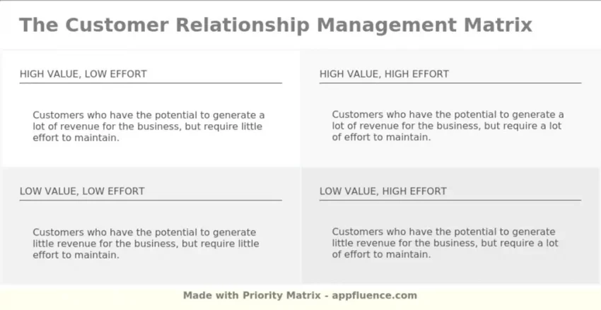What is the Customer Relationship Management (CRM) Matrix? The Customer Relationship Management (CRM) Matrix is a 2×2 matrix used to evaluate customer relationships. It helps businesses prioritize customer relationships based on their potential value and how much effort is required to maintain them. The matrix is divided into four quadrants, each with its own criteria…