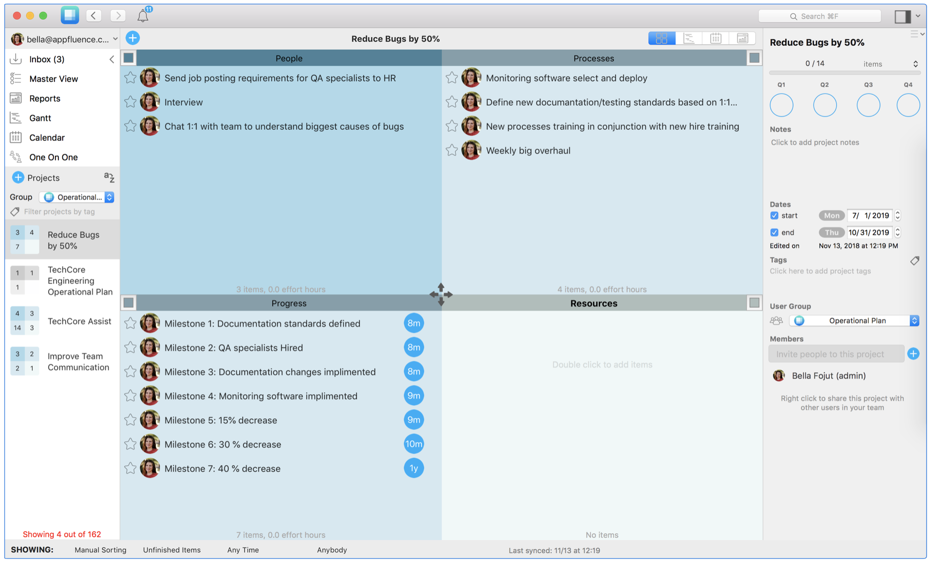 As seen in the image below, the project. “Reduce Bugs by 50%,” is divided into quadrants focusing on People, Processes, Progress and Resources. Quadrants one and two already have tasks to accomplish this 50% decrease in bugs, with the option to assign the tasks to different people. The notes and item details can hold specific details around progress, effort, resources, timeline, etc.